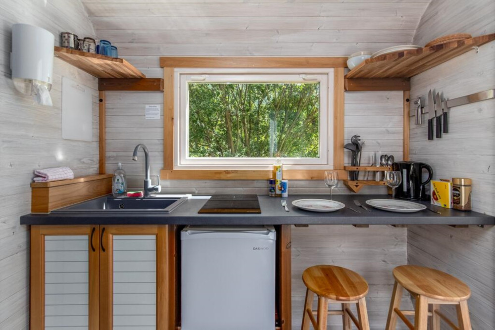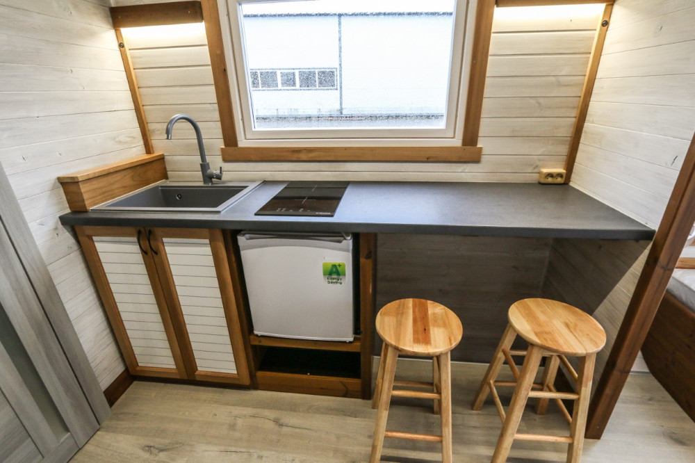 - Køkken med stenvask, elektrisk kogeplade, køleskab,
