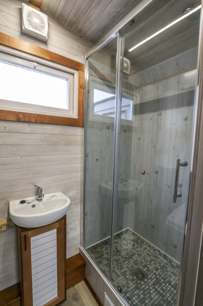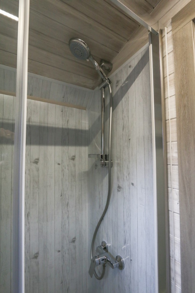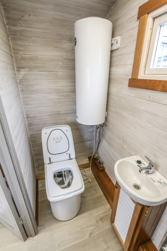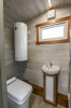 - Badeværelse med lille vask på skab, toilet, vandkoger, bruser,