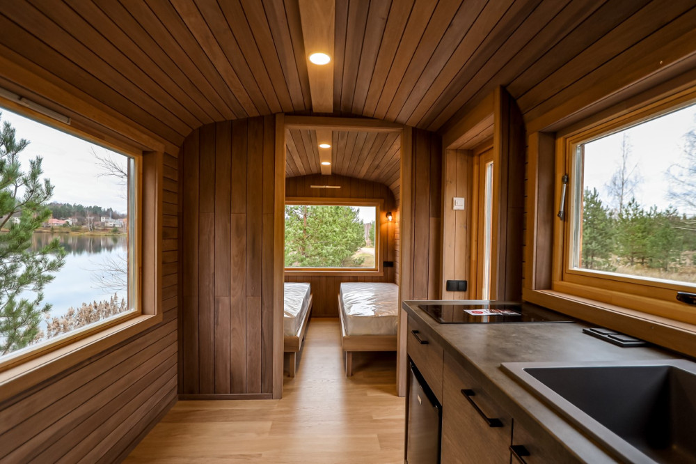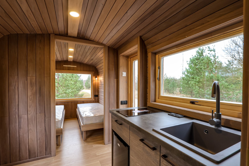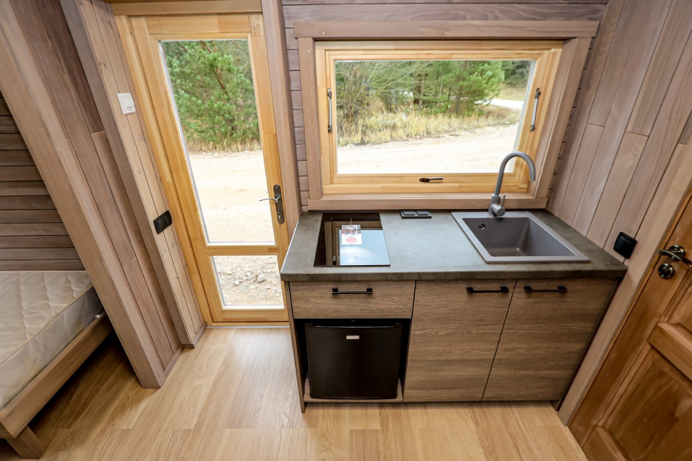 • Køkken med stenvask, elektrisk kogeplade, køleskab,
